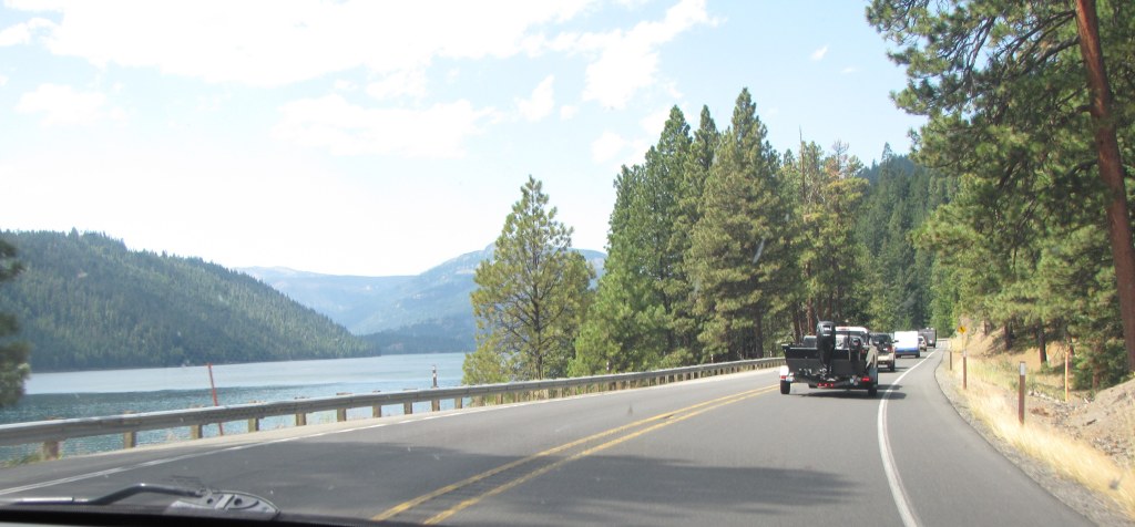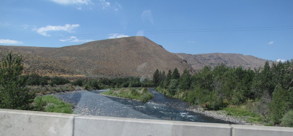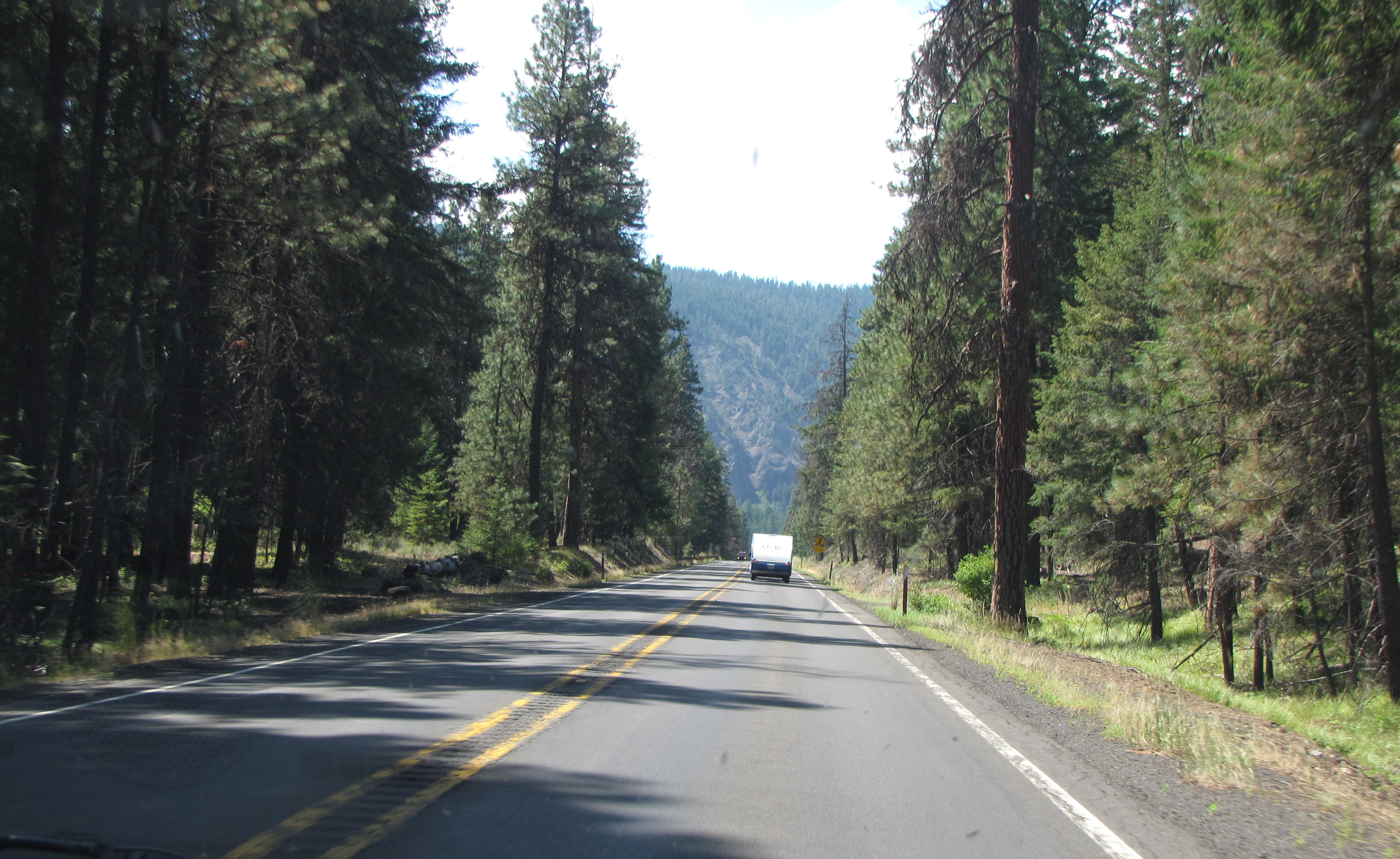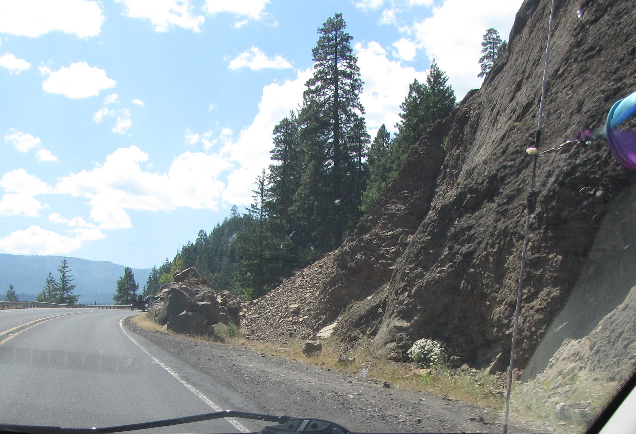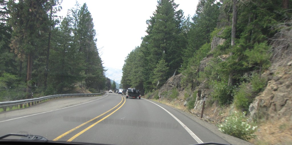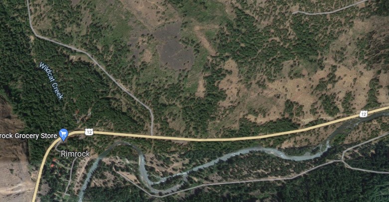 Heading makai along Highway 12 in Washington State along the Tieton River.We’re now traveling through the Wenatchee National Forest. It sure was beautiful!!Entering Rimrock Retreat area.. White Pass – 22 miles, Packwood – 43 miles. That teardrop trailer was moving right along; I think they’re so cute.Tieton River. Listening to Led Kaʻapana as we drive. Somebody better dust this!Aerial view of what we’re driving through.It was so beautiful along here, and we’re still following our friend, the teardrop trailer. Crossing Wildcat Creek.Aerial map of where we crossed Wildcat Creek.Huge rockslide. That must’ve been scary coming down.Tunnel!