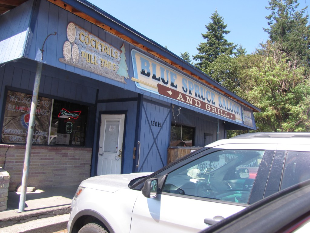 We stopped here, in Packwood, at the Blue Spruce Saloon. Usually places like this have great burgers, and that’s what we wanted. There was a pizza place across the road, but we decided to try this place. We weren’t planning to stay, but to get our burgers and get back on the road. Which is just what we did.