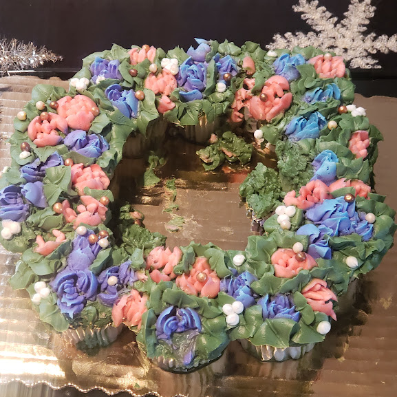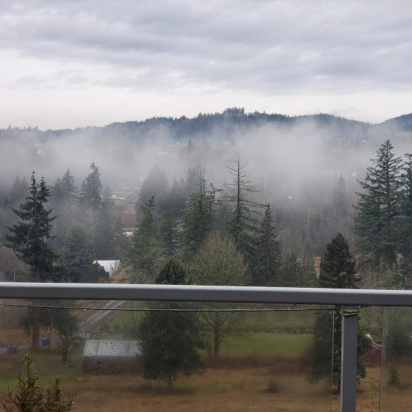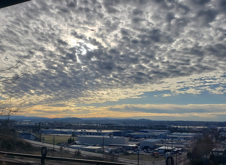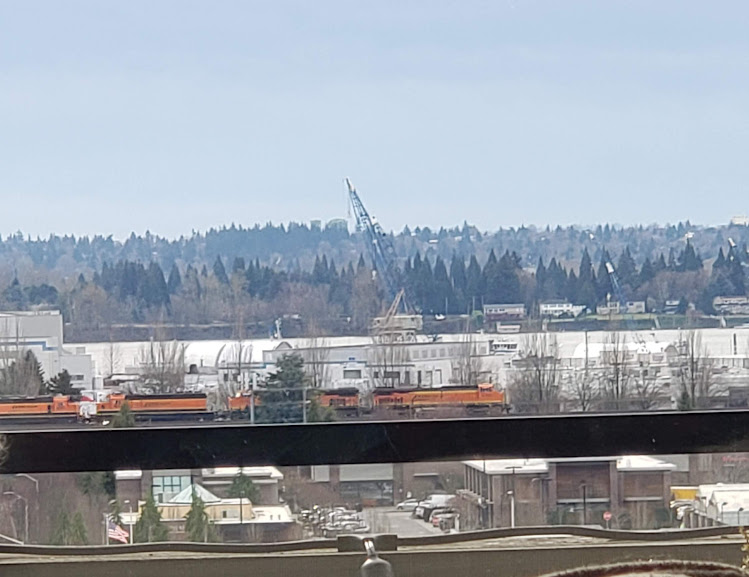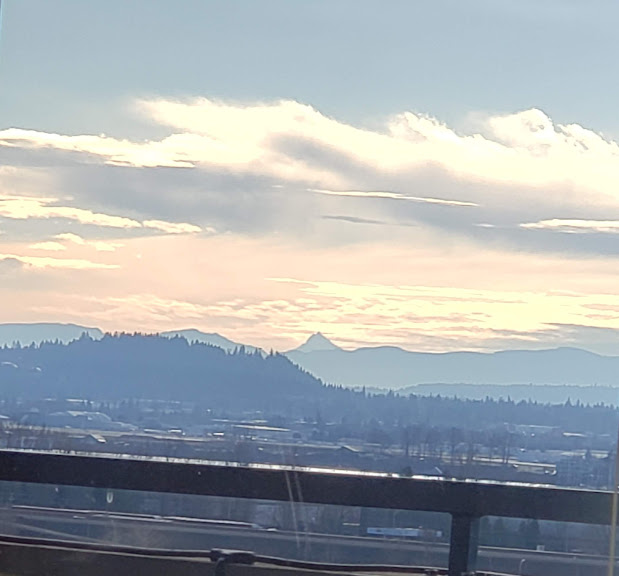 Pretty clouds looking southeast from Vancouver, where Da Gathering met today.Can you see Mt Jefferson in the distance? Jet heading toward PDX with Mt Jefferson in the distance.Train!!One friend brought a cupcake cake for dessert! She didn’t make it, though. Sure is pretty!