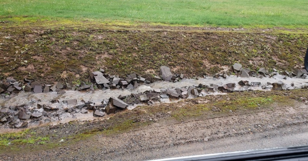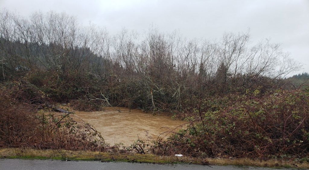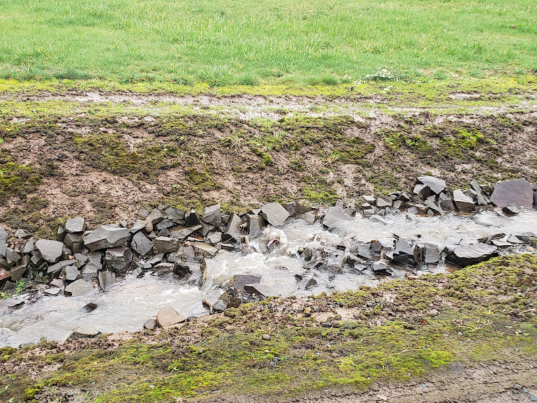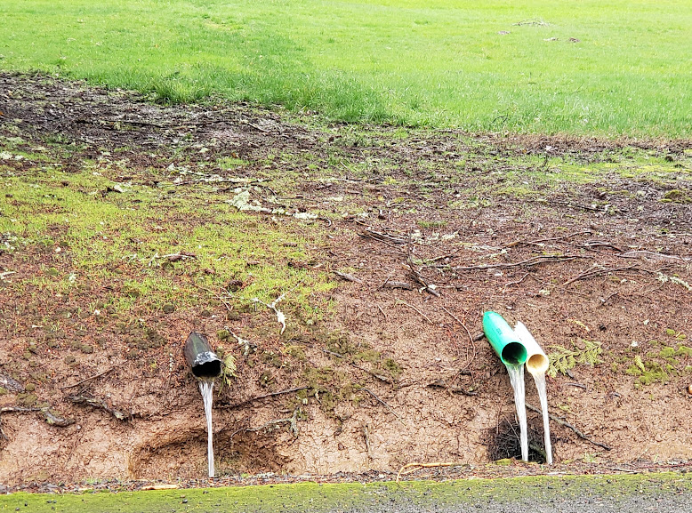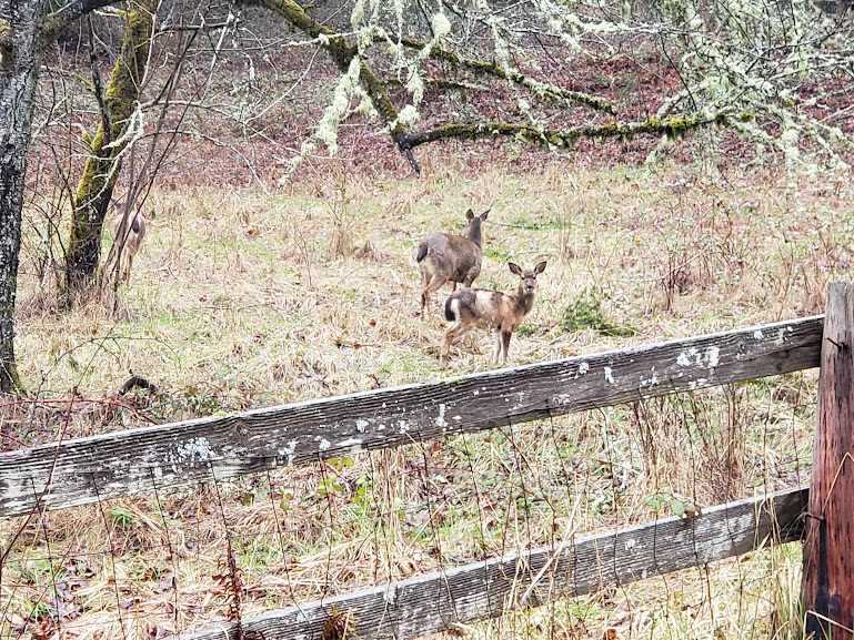Kalakoa looking cute in her scratching da kine.Ballerina daily hummingbird.We had a huge rainstorm last night and today. This is the usually quiet creek along Sunshine Valley Rd.The water was pouring out of the drainage pipes at our neighbors’ place.Drainage ditch along our road.Our own private waterfall. Whoo hoo! ʻEkolu deer in the pasture!! The third one’s kinda hard to spot.Pondering life daily hummingbird.