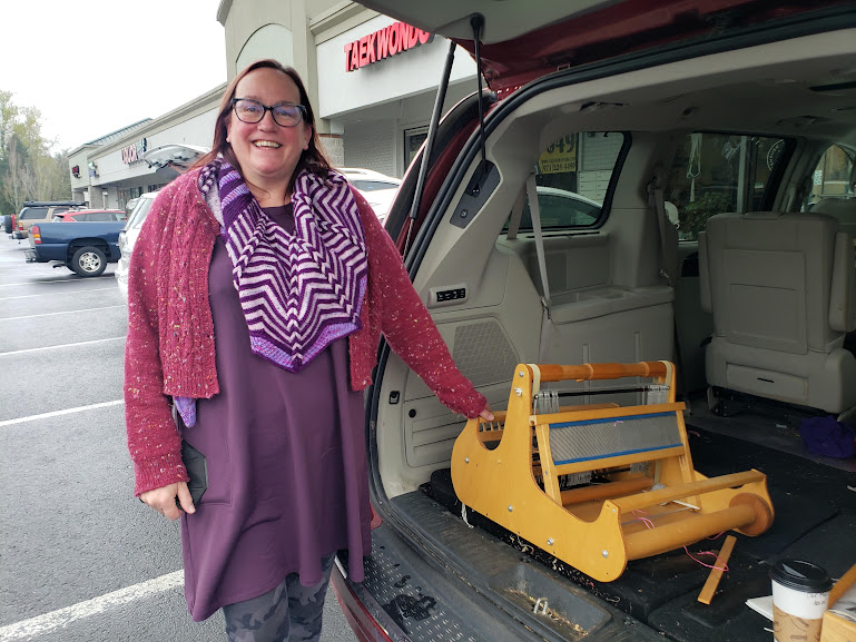 The loom with its new owner, who’s also an amazing knitter.