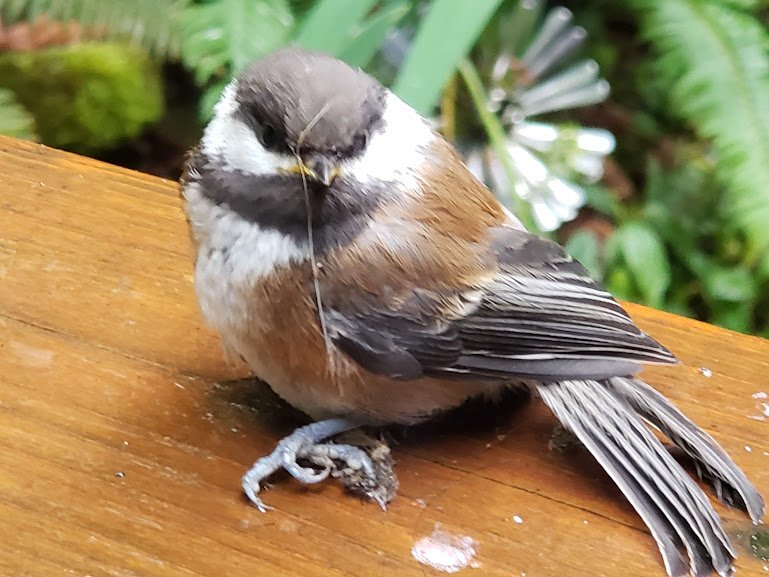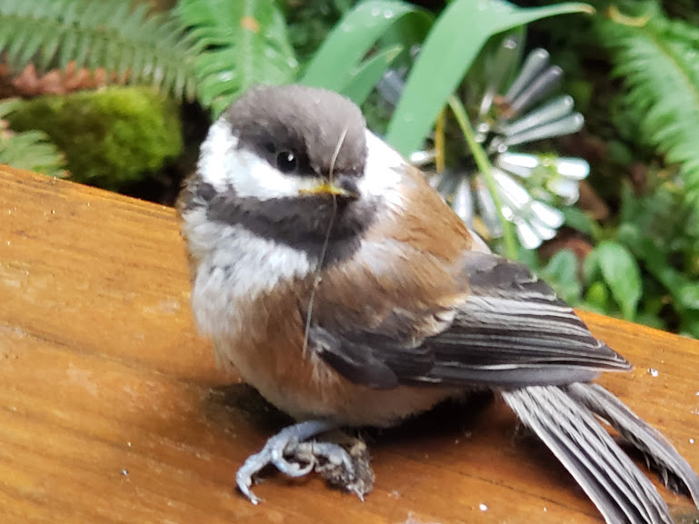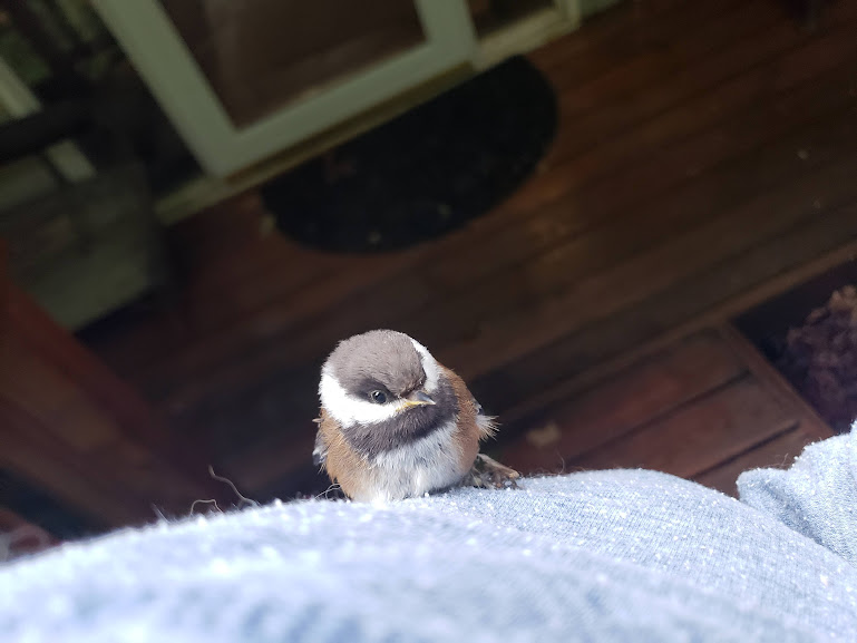 Feisty daily hummingbird not liking the Goldfinch on his perch!This baby Chestnut-Backed Chickadee bumped into our front window today; I set him up here to check him out and he just sat there, feeties all curled up. He was a little stunned, but seemed to be okay otherwise.He sat there, recovering. I think he may have just fledged because his feeties looked like they wanted to be in a nest.His eyes were bright.