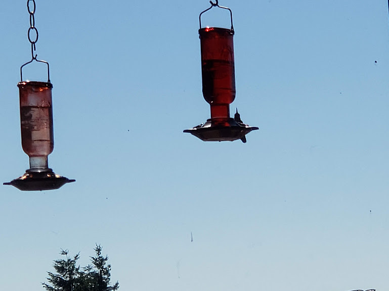 Daily hummingbird showing some color. It was hard to get a good photo of him because he kept moving. His gorget shone so beautifully in the sunshine!