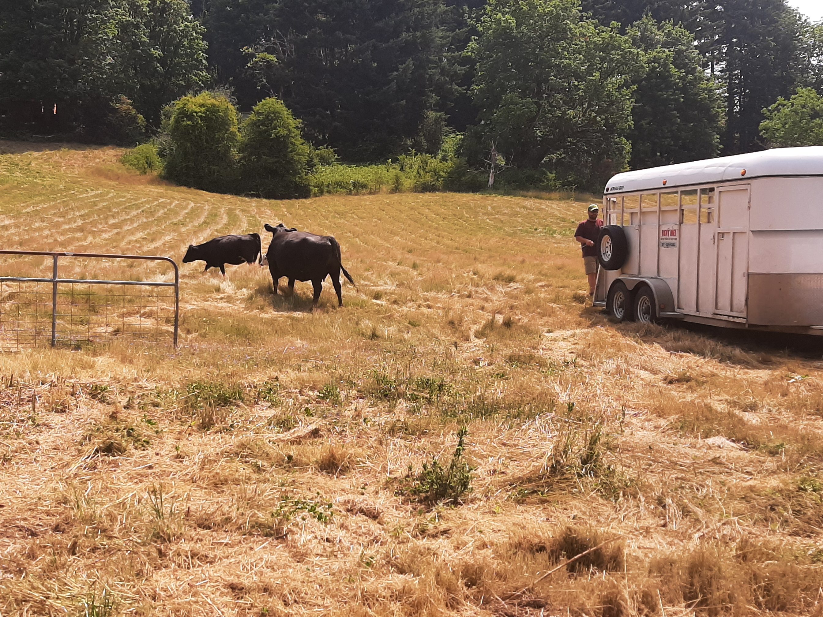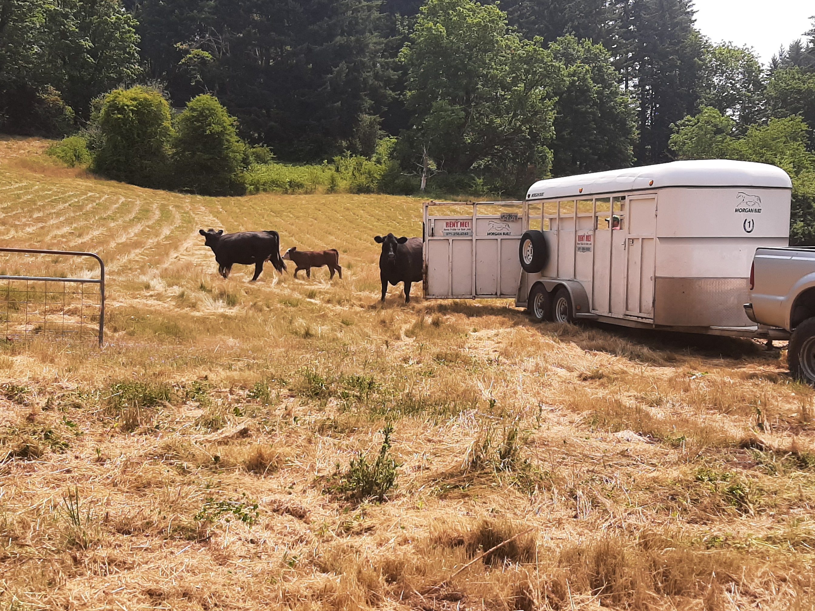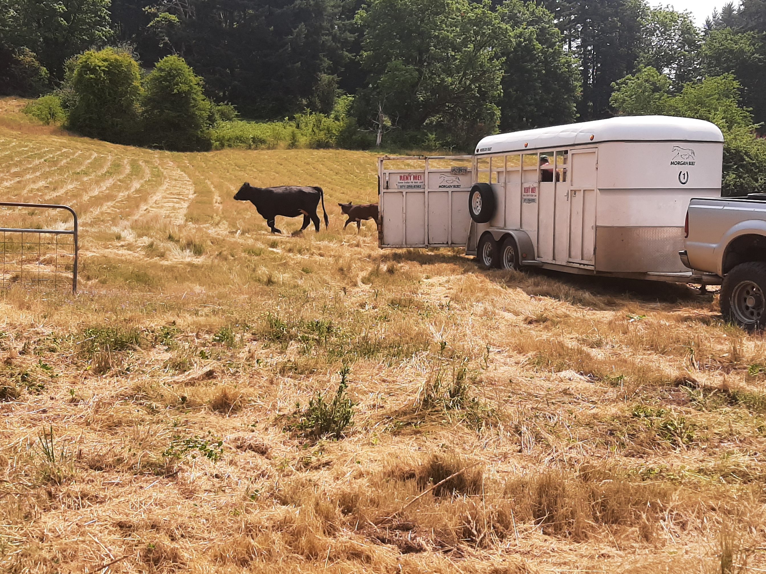 Yeah!!! We are now boarding chree pīpī! Da mama, her yearling calf, and her new calf. It’s been so hard to keep this secret, but I didn’t want to say any kine until it was definite. Jake and Sarah brought over the chree cows today. Here’s Mama and her yearling heifer just coming out of the trailer.