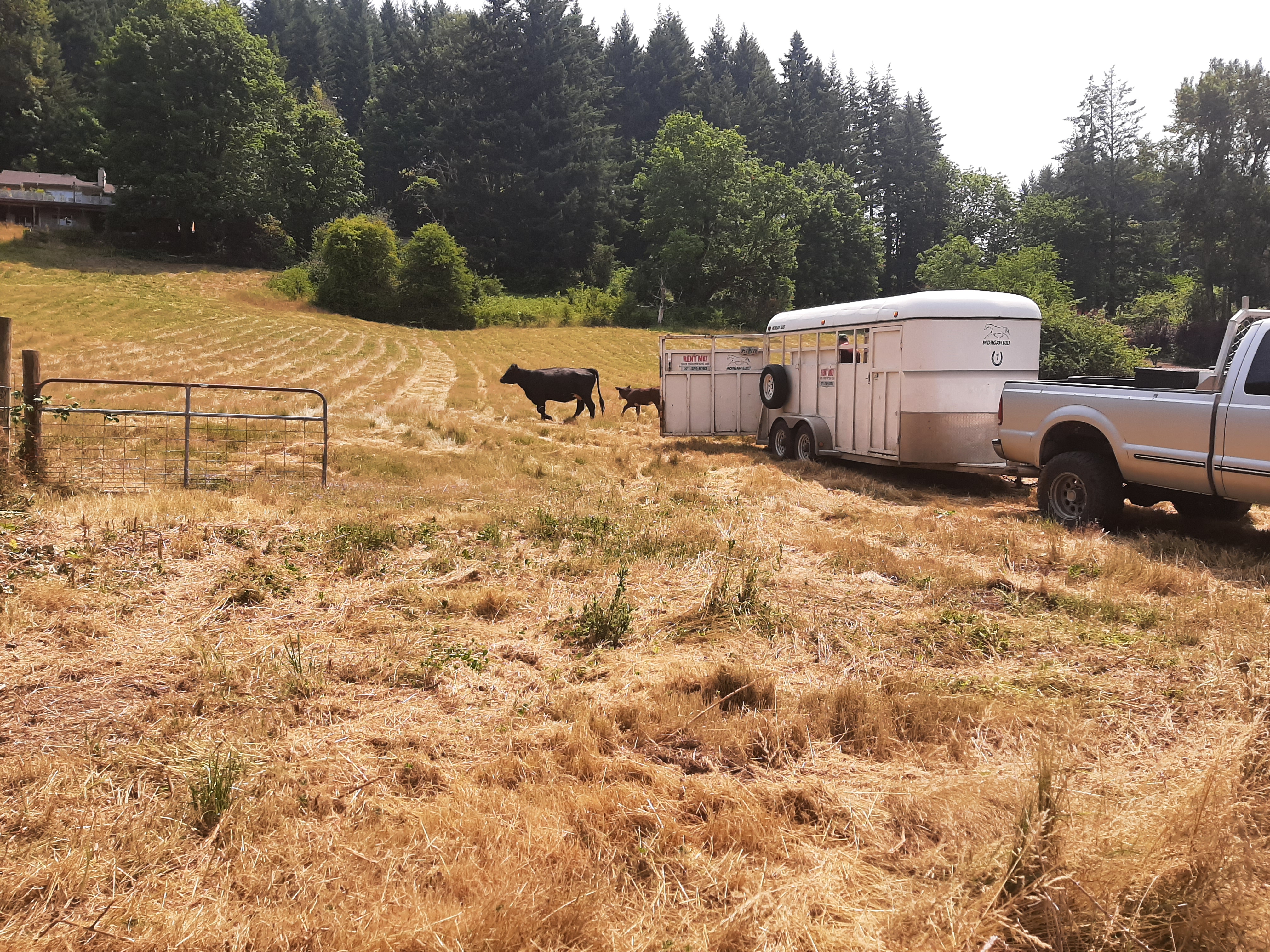 Yeah!!! We are now boarding chree pīpī! Da mama, her yearling calf, and her new calf. It’s been so hard to keep this secret, but I didn’t want to say any kine until it was definite. Jake and Sarah brought over the chree cows today. Here’s Mama and her yearling heifer just coming out of the trailer.