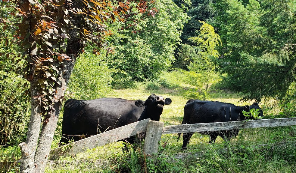 Oh, the mooing that has been going on today! I’m sure she’s saying, “Hui, AFK!!!” They all wandered all the way up to the top of the hill and started munching on alder leaves.