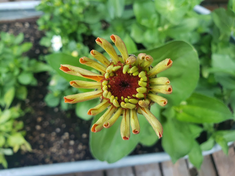 That’s a marigold. I have one zucchini blossom but it’s male and no girl flowers yet. Hopefully soon. I wish I had more bees to help pollinate. We have tons of bee flowers, but hardly any honeybees. I miss them!