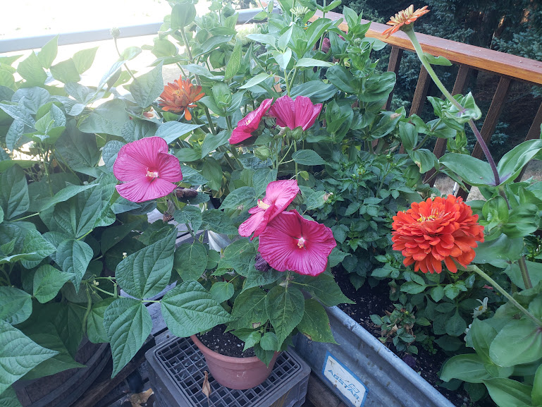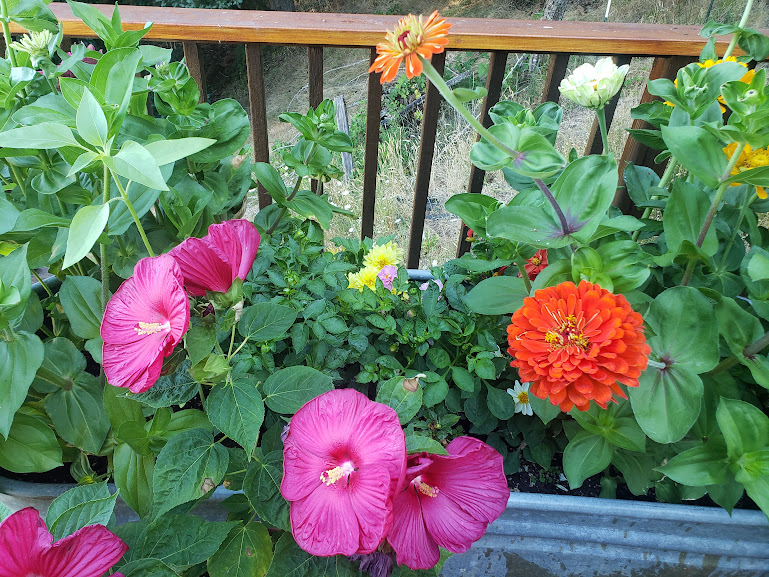 Springtime flowers; zinnias, mallow-kine hibiscus.