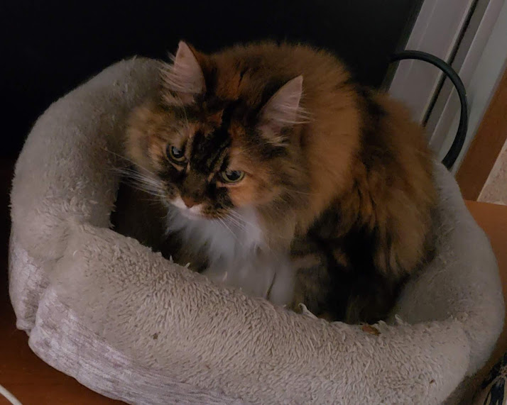 It got cold today, and Kalakoa got into her bed underneath my computer desk for the first time in ages!