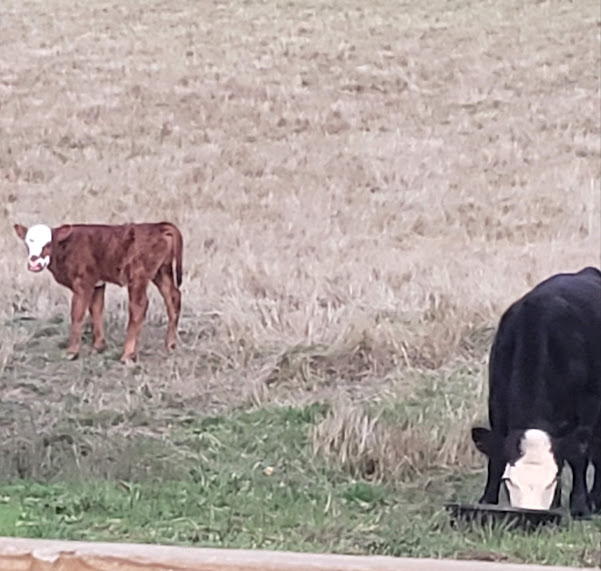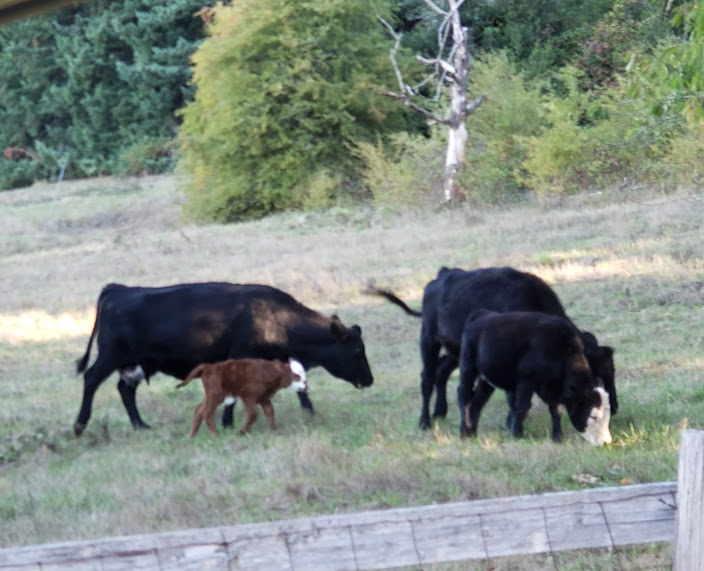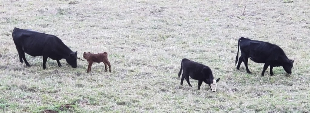 Except for early yesterday morning, we hadn’t seen the new calf for two days and were getting a little worried. So I called Jake and he and Sarah came over. Bessie came down from the hill, and we suspected that she’d stashed the calf up in the forest, since that was where I’d last seen her. So Jake and Sarah drove their SUV up in that direction.