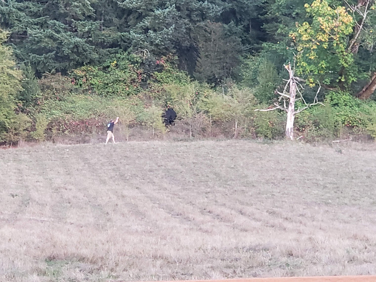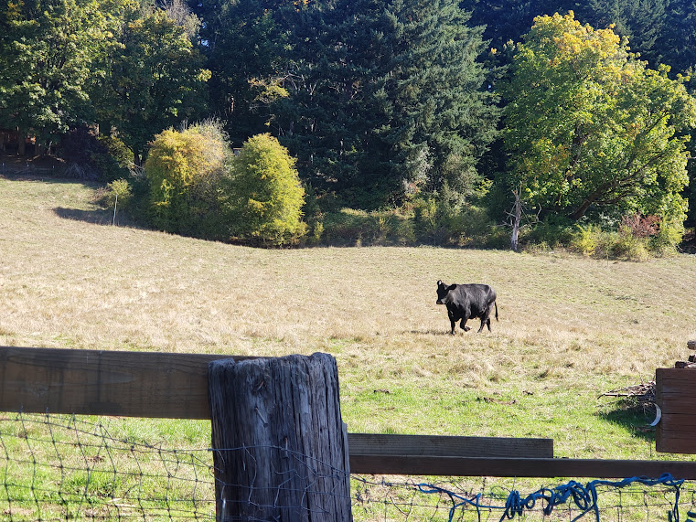 Sarah stayed with the pickup up in the forest for a bit and Jake walked across the pasture to the brush and then Sarah drove the pickup back down again. Jake has a construction company and works hard in all kinds of dirty machinery during the days; we were grateful that he’d come over from work, tired and in work clothes, to look for the calf in places where we couldn’t get to. Bessie had gone back up into the brush directly up from the gate, and we all saw her go into the brush; at that point, we knew that was where she’d stashed her baby.