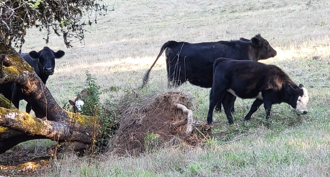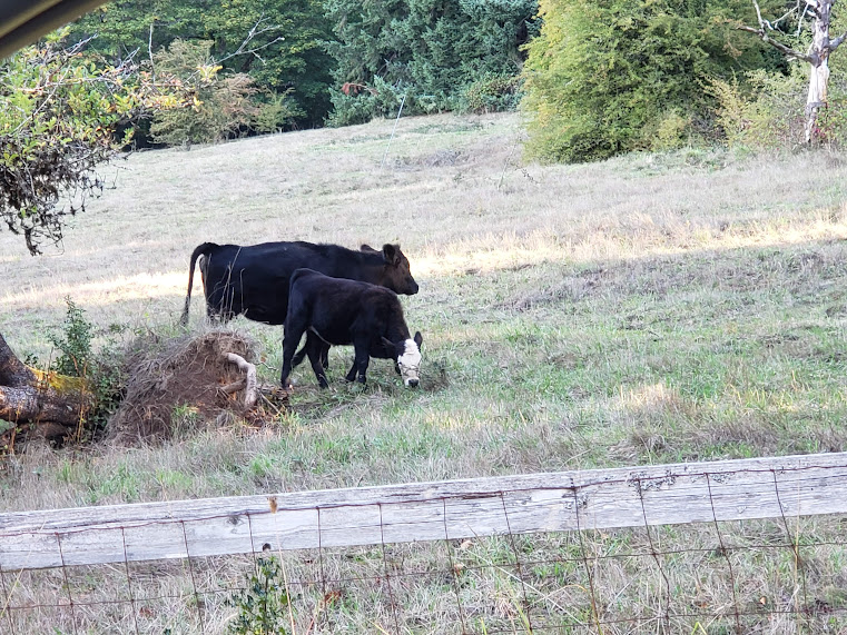 Except for early yesterday morning, we hadn’t seen the new calf for two days and were getting a little worried. So I called Jake and he and Sarah came over. Bessie came down from the hill, and we suspected that she’d stashed the calf up in the forest, since that was where I’d last seen her. So Jake and Sarah drove their SUV up in that direction.