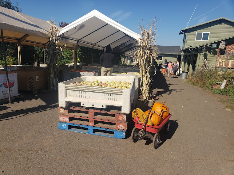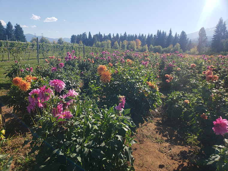 In Hood River, at Mountain View Orchards. They had a wonderful dahlia garden, so we wandered in it for awhile. It made up for not being able to see all of Swan Island Dahlias.