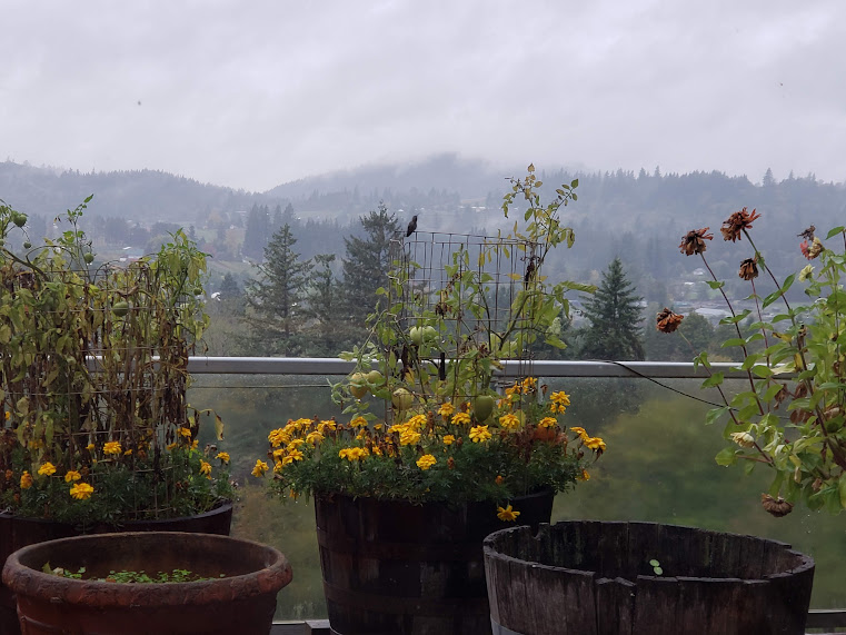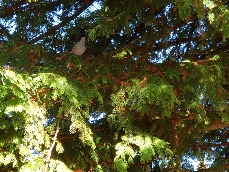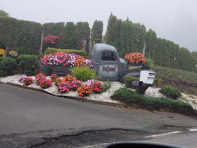I love their skittering feeties!Our neighbors’ maple on a foggy morning.Food deliveries. Lots of muesli today.I do love all the flowers in this ancient pickup.Mourning Dove in the tree at one of my food delivery places.