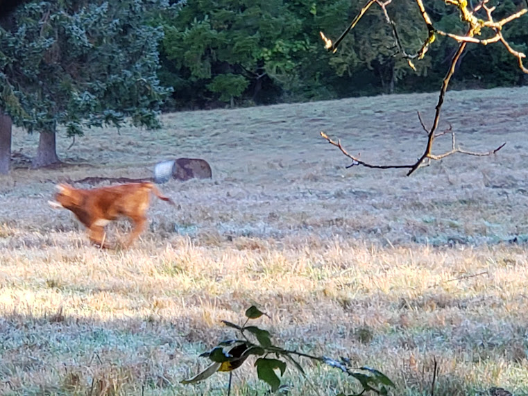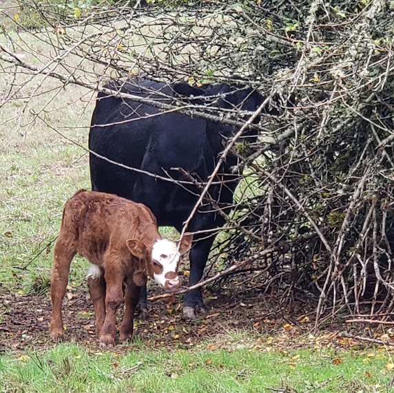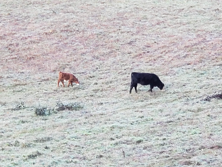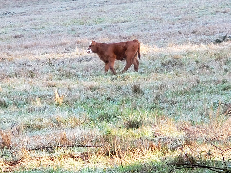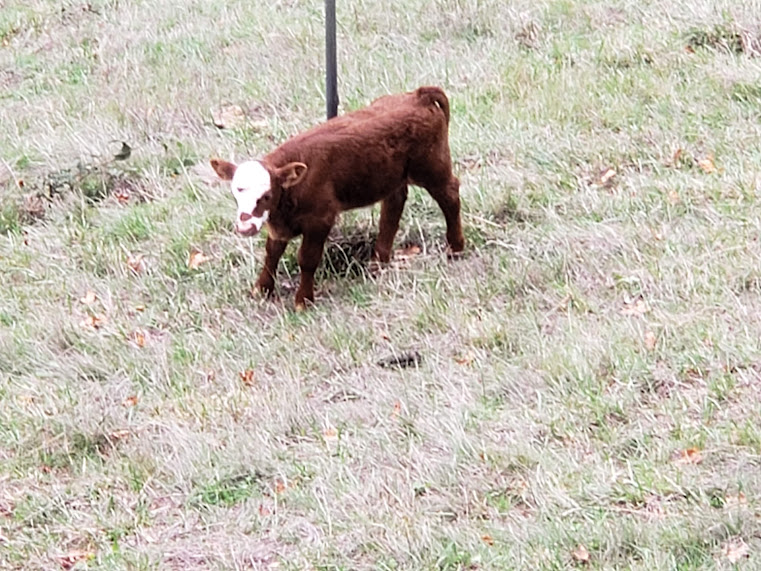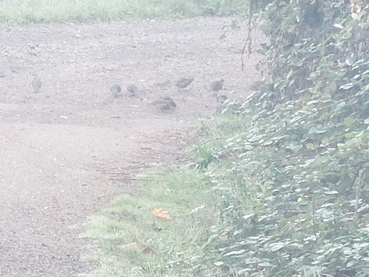 Boy, this is the post of the cute and the beautiful. The calf seems to think the pole is a new toy of some kind. That was a nice little flock of quail you encountered! And I also love the fog layers.