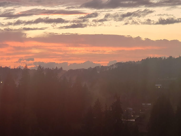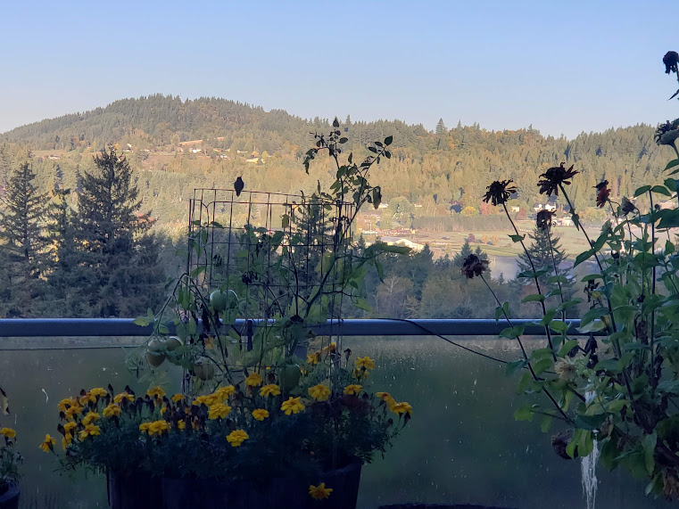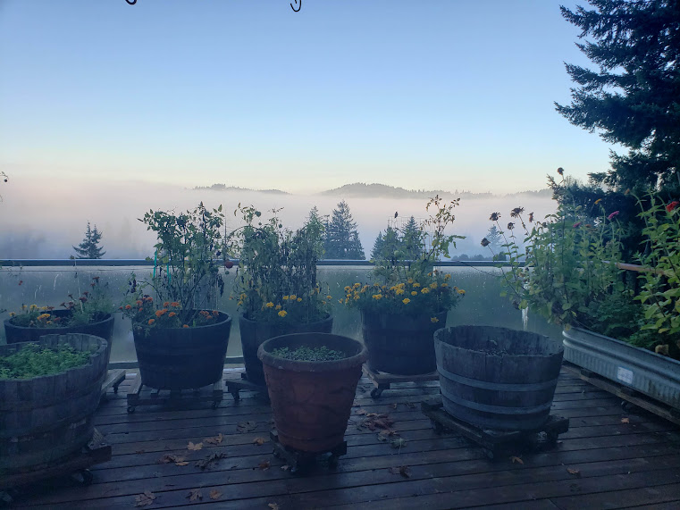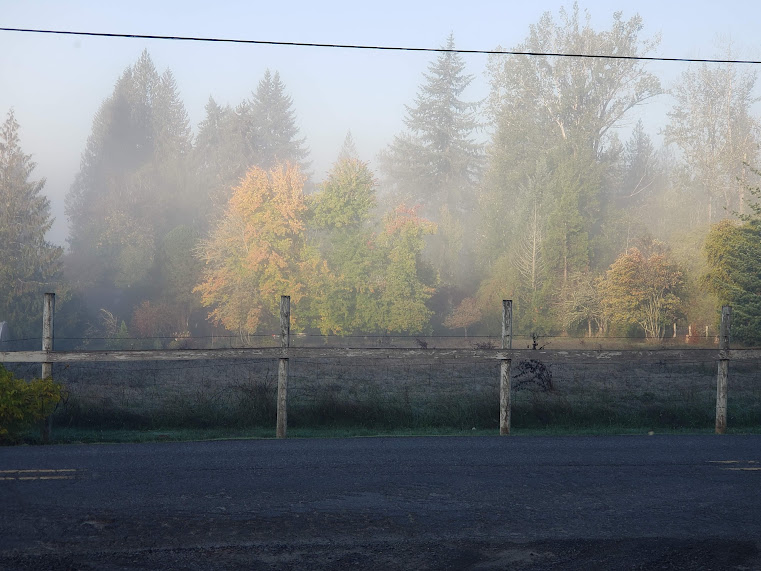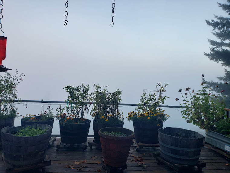 All fogged in this morning.Then it started to clear… I love it when I get a view like this.Daily hummingbird in the fog.A splash of sunlight on the cottonwood tree through the fog.Quail!