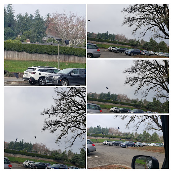 I wish the photos were more clear…collage of the murder of crows who kept me company while waiting today.