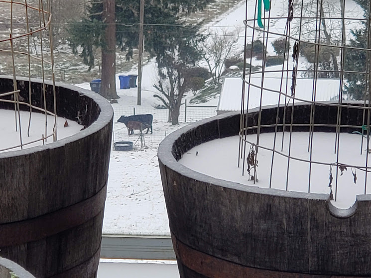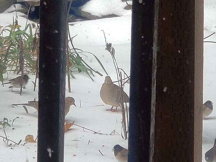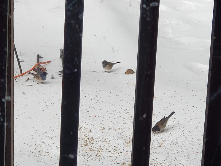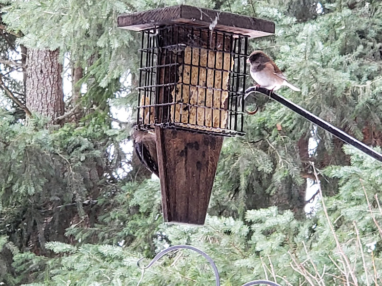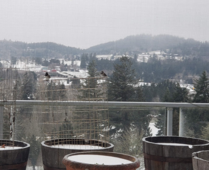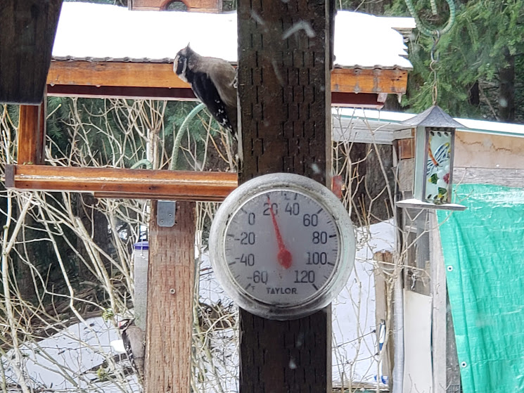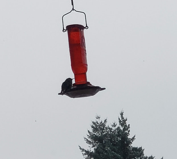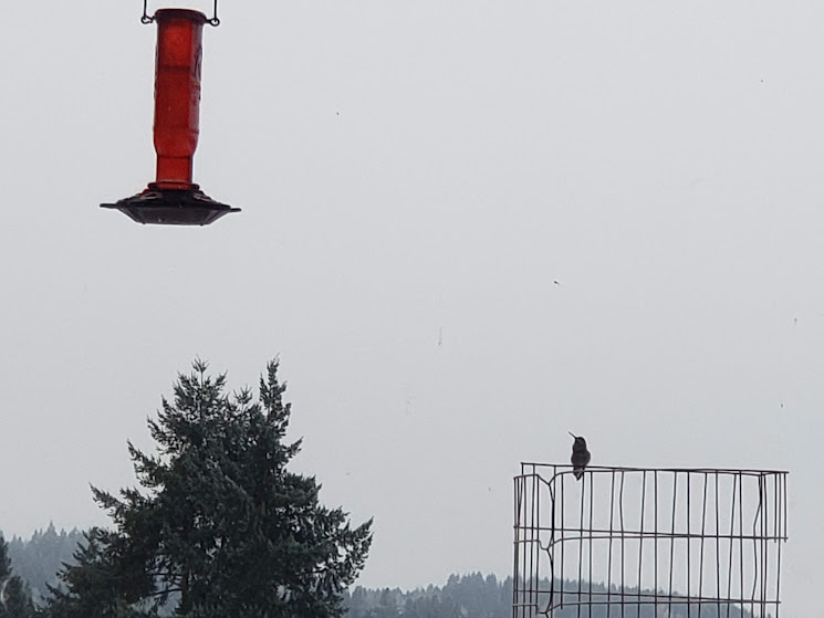 It’s made from myrtlewood, black walnut, and purpleheart. I can’t wait to pick it up. It was made by a local woodworker.Two daily hummingbird wannabes.Even with auxiliary heat on, our heat pump is having a hard time keeping up first thing in the morning. But I’m so grateful it’s working!Daily hummingbird trying to stay warm. I keep switching out the feeders for him.Olsons’ barn across the valley. The ice isn’t deep like snow would have been.This is the way I had to photography Bessie ands Kiko; it was too slick for me to walk out on the deck. Daily pīpī.Lani Moo peeking out of the barn. That’s as far as she got. Kiko was braver than she was!Downey Woodpecker.Juncos. They don’t call them snowbirds for nothing!Downey Woodpecker and Junco at the suet feeder.Nuthatch and flying Junco.Mourning Doves joined the crowd!Flicker with a Junco waiting his turn.Daily hummingbird.