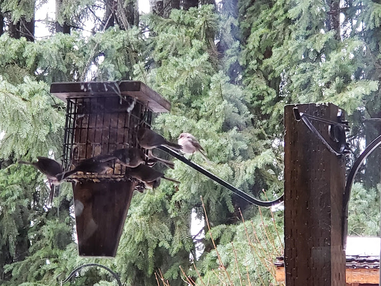 Wow. Dat is some scaaaaaaary ice. I love the juncos trying to get in on the suet action among the bushtits. I also love that I can hear some slack key guitar–is that Led?