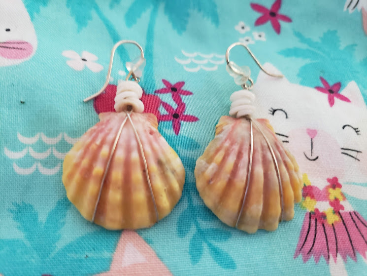 I took out three in my right ear (cuz da bottom puka is for my fancy-kine earrings). I get a lot of them from Traci back home, cuz I’m homesick, yeah, and this way I feel small kine closer to home. Like these ones made with cone shells and ʻopihi shells. I just love them!