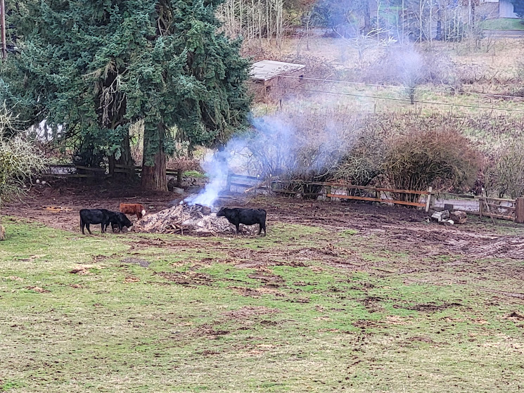 Jake and Jake2 came over today and started the burn pile. The cows loved the warmth!