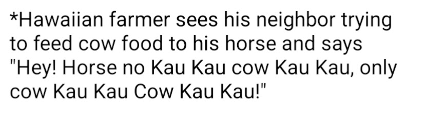 I grew up hearing this and still love it. (“kau kau” is food, for those of you not from Hawaiʻi.)
