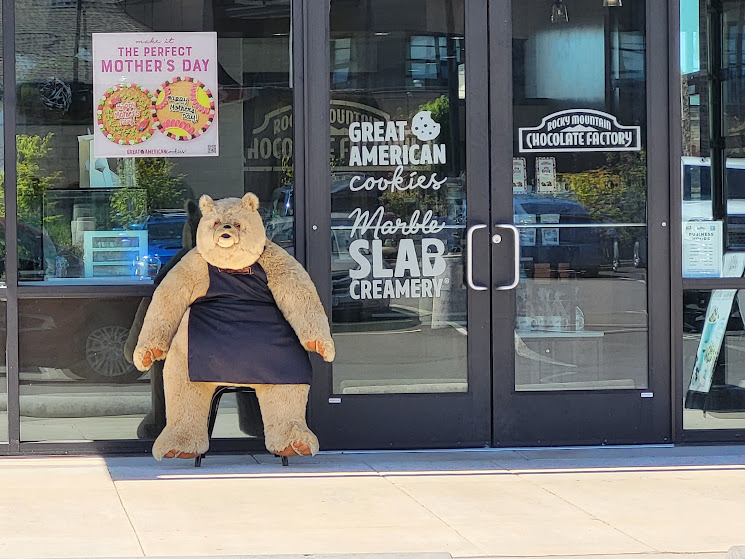 All Rocky Mountain Chocolate Factory stores seem to have that Bear out front. I don’t understand why the Bear looks so grumpy when he’s in front of a candy store! Maybe it’s because they won’t give him any. I’ll email you a photo I took of G mugging with a bear for me. (One of the reasons I love him.)