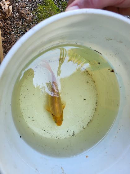 Josh helped us clean out the fish pond. This is the only goldfish that survived the winter.