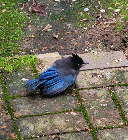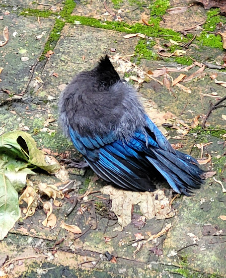 I walked out the back door today and saw this and thought, “Oh no! He’s dead!” But no, it was a fledgling Stellarʻs Jay, sound asleep! I walked up to him and he didnʻt move for quite awhile, but when he woke up he hopped a bit further away.