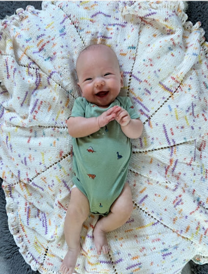 I understand why your cutie-pie grandnephew is so happy–he has a beautiful blankie made with love just for him!