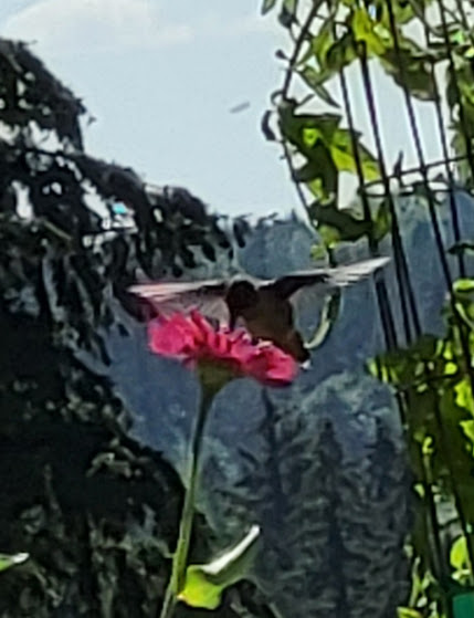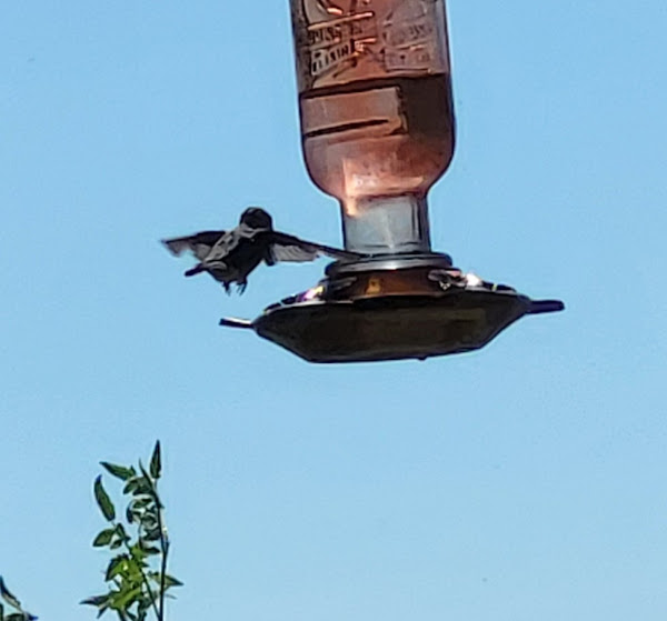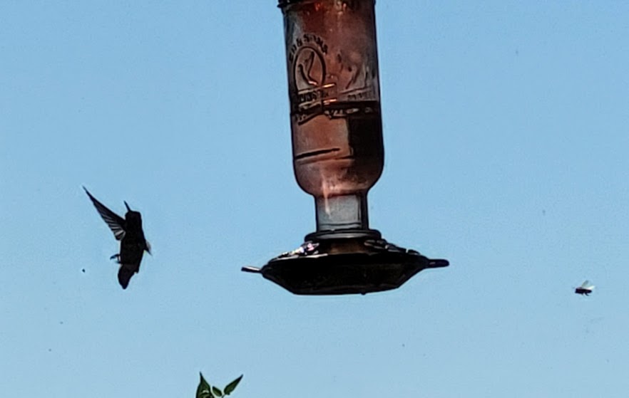 The hummers are in competition with bees, not just themselves. I didn’t realize till I was editing the photo that I’d gotten the bee in this photo!