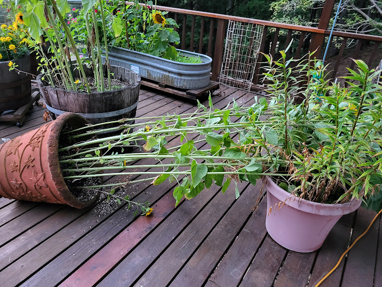 We were eating dinner tonight when all of a sudden out of nowhere, came this huge gust of wind! It lasted not even a minute, but this is what it did. Fortunately, the sunflowers were still okay, though Nolemana had to stake up a couple of them.