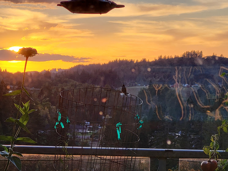 I was having trouble getting daily hummingbird photos, and I thought maybe it was because they didn’t like the sunflowers being so close to their perch on the tomato cages. So I asked Nolemana to move the sunflowers, and the hummers are definitely happier.