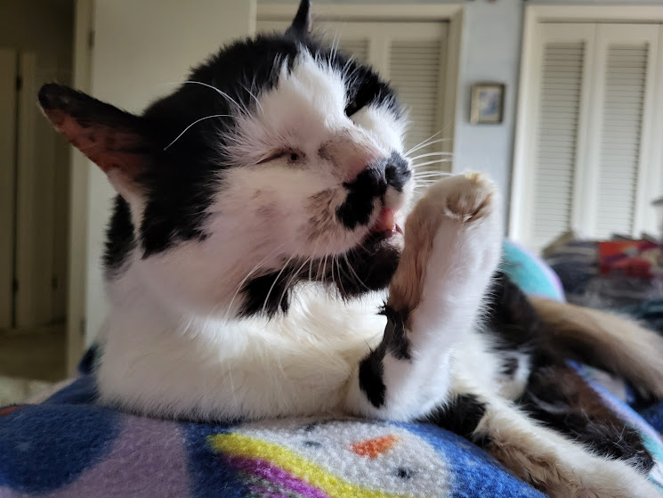 I’m treasuring all my moments with Keola. His face is dirty because it’s getting harder and harder for him to eat. This is what’s so awful about his diagnosis: he acts totally normally, purring, cuddling, talking to me, all day long. I help him clean his face when he’s pau cleaning his paw, which he uses to scoop up his food.
