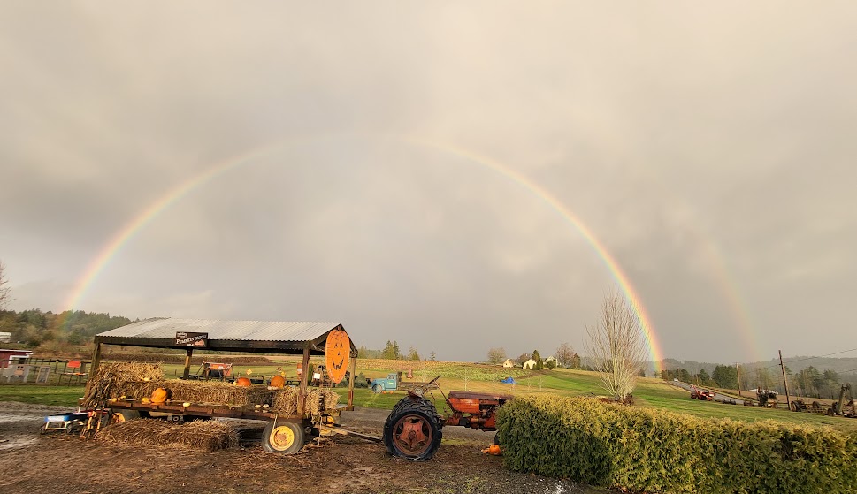 The sun came out and was shining behind us on our way home, and I just knew that we’d be seeing a rainbow at some point. By the time we got to Damascus, it was just appearing, and I knew just the photo I had in mind. I hustled as fast as I could to get there. We kept exclaiming how bright and beautiful the rainbow was; I can’t remember a time when I’d seen one like this, reaching across the entire sky from north to south. When we got to Olson Farms’ farm stand, it was raining pretty hard, but because no way would I let that stop me, I hopped out of the car and got this amazing photo…and it was a double rainbow, too! I didn’t care how wet I was getting at that point!