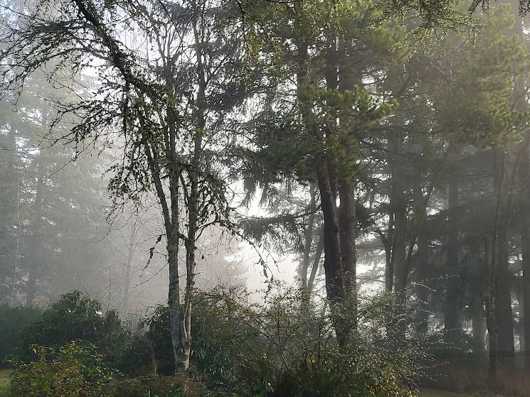 Fog through the trees, mid-afternoon, at The Gathering.