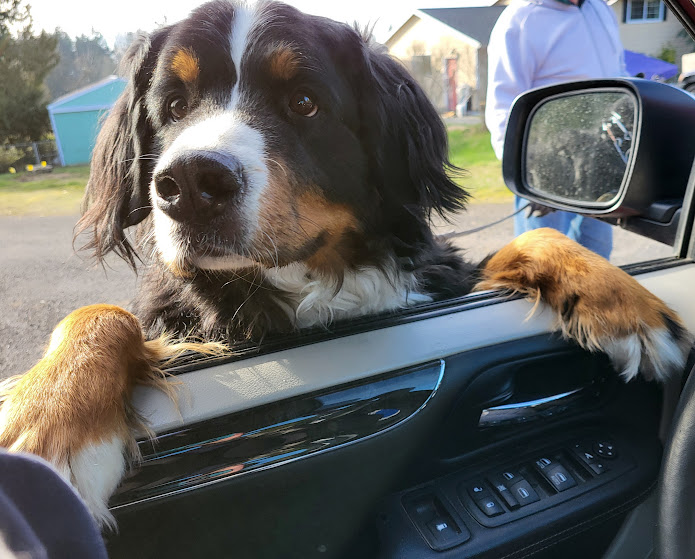 This is Bernie, the Bernese Mountain Dog we frequently see during one of our food deliveries. He knows we always have treats for him. If he sees us coming, he pulls his owner along to meet us. And if we come up behind him, he’s always stopping and looking back to watch us approach.