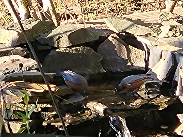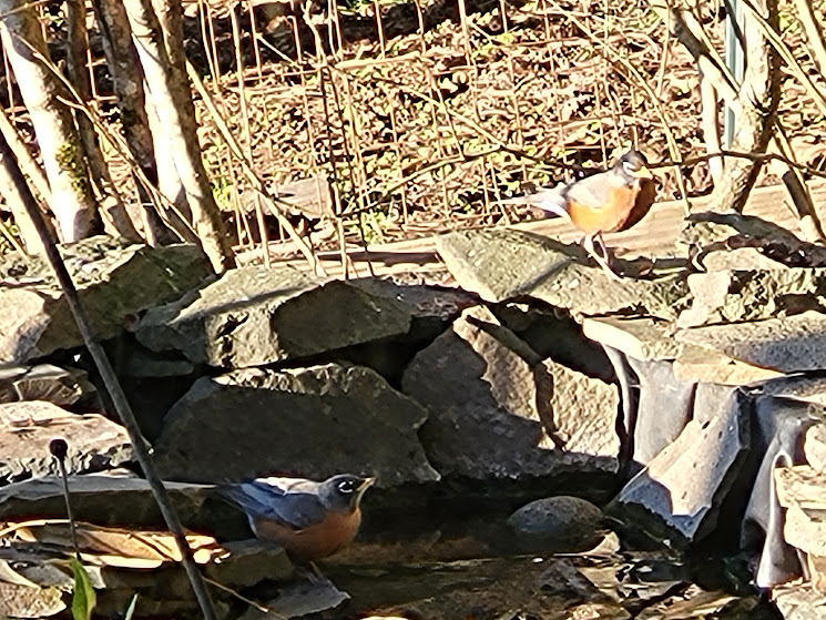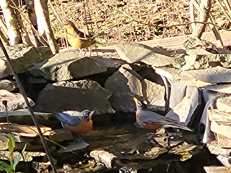 Today’s treat: Robins and a Varied Thrush at our pond/waterfall!