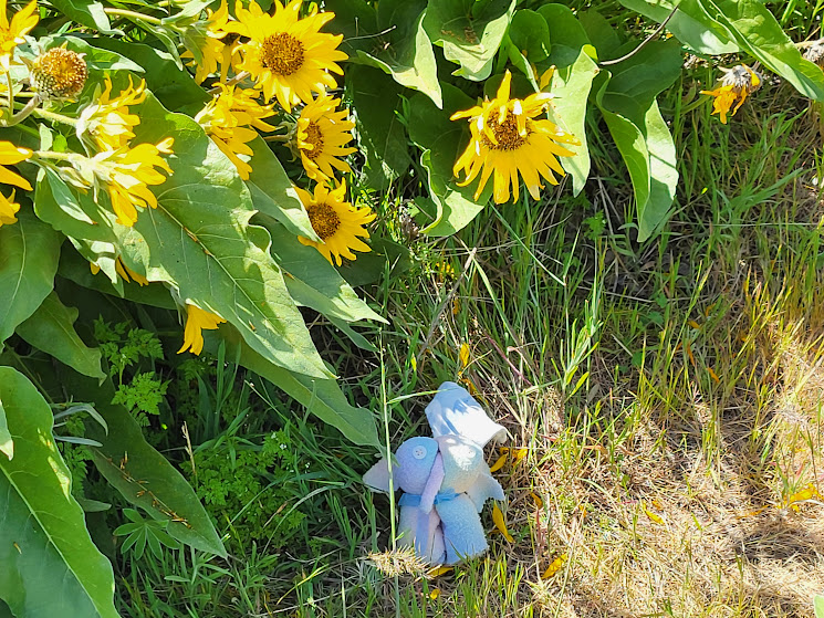 But we got out to walk a little bit, and of course, Musubi wanted to have his photo taken with the Balsamroot; his cape was blowing in the wind.