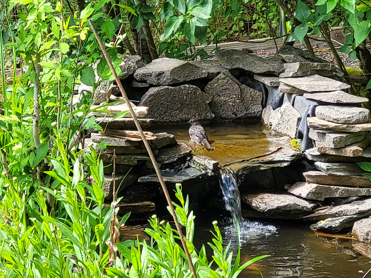 A very wet robin taking a bath in our pond.