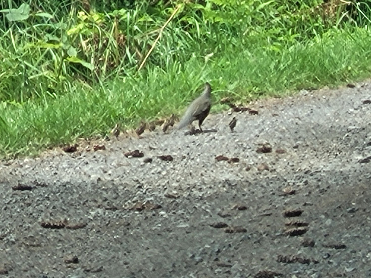 Ho da kewt!!! Mom quail and her babies. I wish it were a better photo, but they kept moving so fast that it was hard to get a better one.