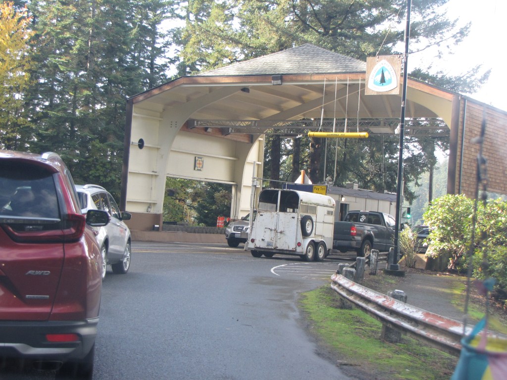 We’re waiting at the toll booth to cross over the Columbia River at Cascade Locks.